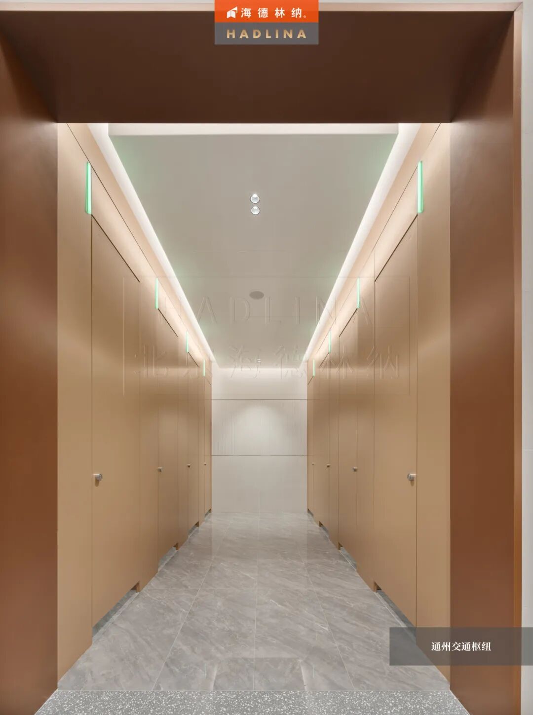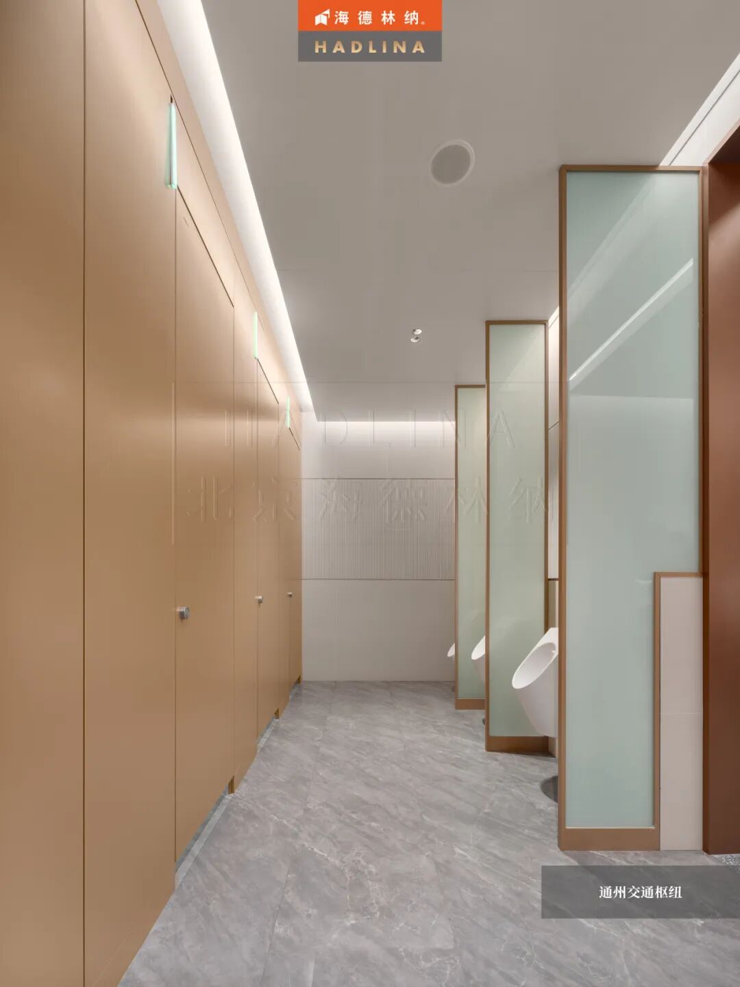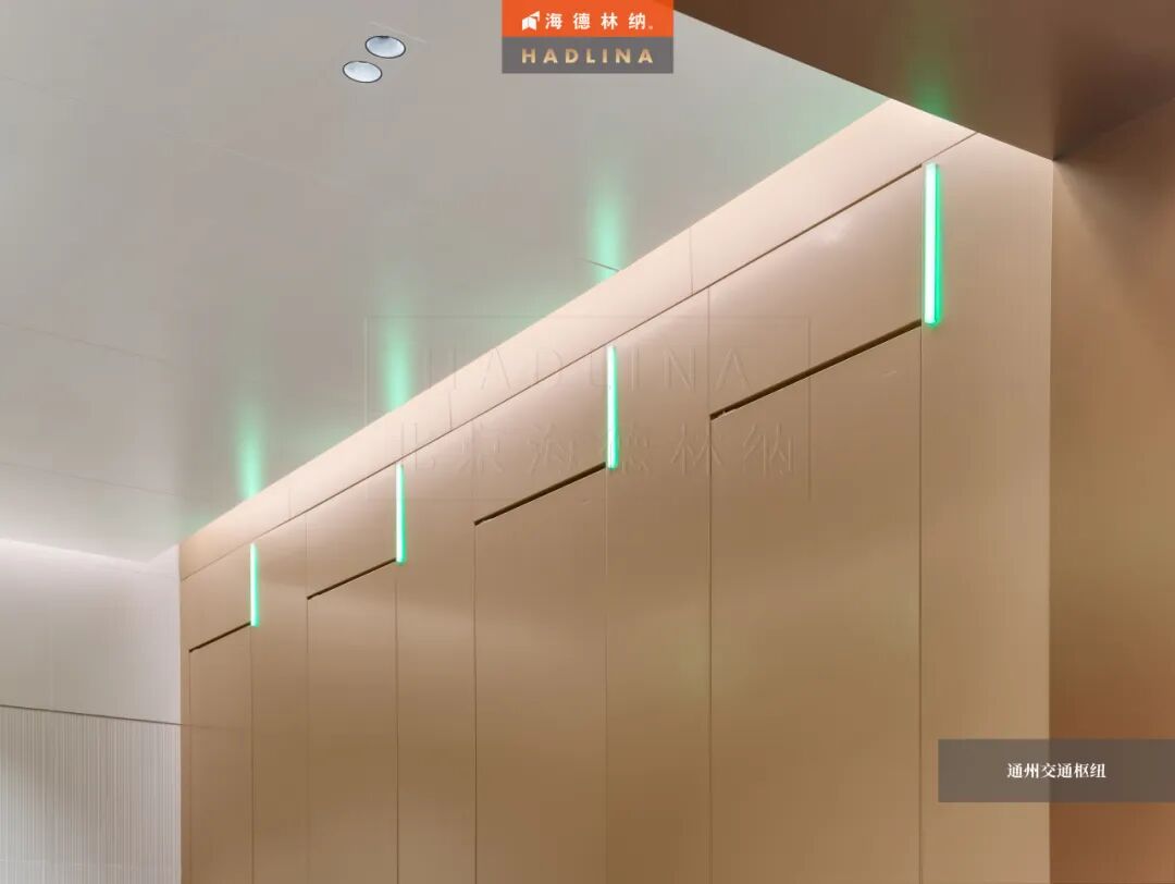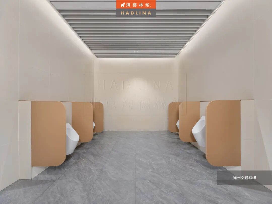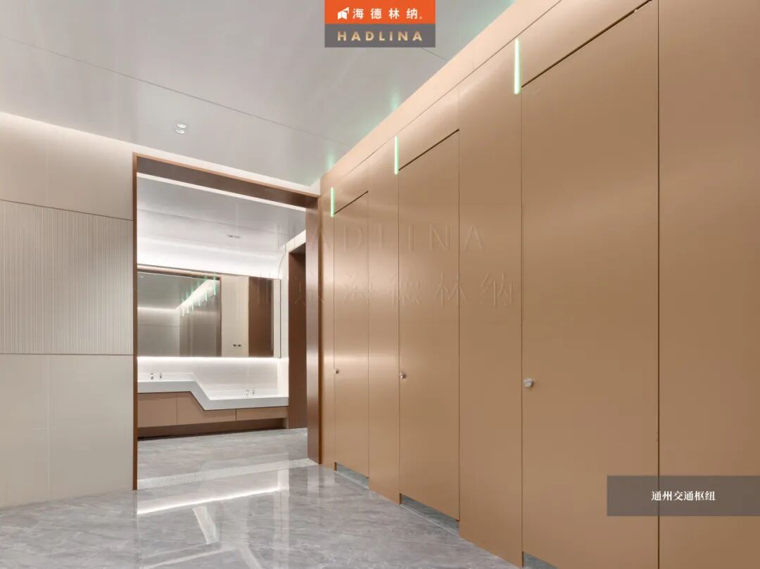 在此次通州交通樞紐項目中,海德林納?很榮幸為其公共衛生空間提供了定制化的隔斷系統解決方案。項目采用天地式安裝方式,確保隔斷在高人流環境下的穩固與耐用。26mm厚鋁蜂窩復合板材,子母口邊型與暗連接工藝相得益彰,讓每一塊板材之間的銜接如絲般順滑,呈現出渾然一體的視覺美感性。